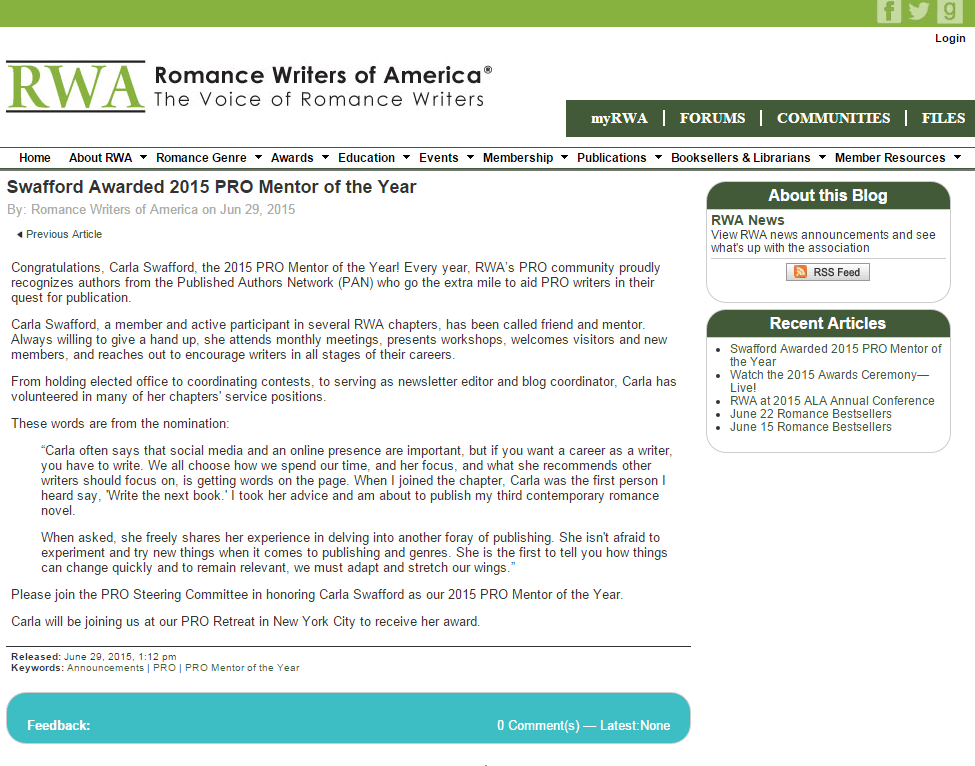 In 2015, I proudly received RWA’s Pro Mentor Of The Year Award. (See article at bottom of page.) Awesome!